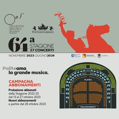 Si avvisa il gentile Pubblico che da venerdì 13 ottobre è aperta la campagna abbonamenti per la stagione 2023/2024 dell’Orchestra Sinfonica Siciliana. I rinnovi per gli abbonati della stagione 2022/2023 potranno essere effettuati presso il botteghino del Politeama Garibaldi fino al 27 ottobre. Dal 28 ottobre i posti rimasti disponibili potranno essere acquistati dai nuovi abbonati.