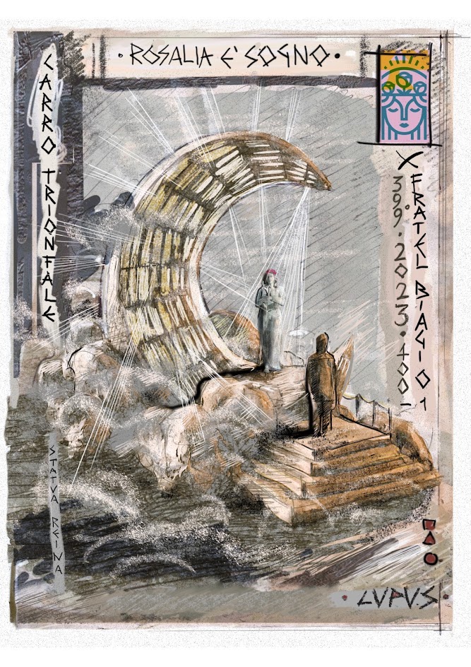 Ad accogliere il Carro - Luna il Teatro Massimo e sui due piloni di Porta Felice, le figure sorridenti di Biagio e Pino prenderanno vita e voce, assumeranno il compito di proteggere Palermo insieme a Rosalia, riunendo simbolicamente tutti i beati che hanno vissuto nella nostra terra. E non appena il carro attraverserà la porta, un ventaglio luminoso darà il segno alla città, che grazie a tutti loro e grazie alla nostra Patrona, ancora una volta stare tutti insieme riuniti nel Festino ha segnato la vittoria sugli incubi.