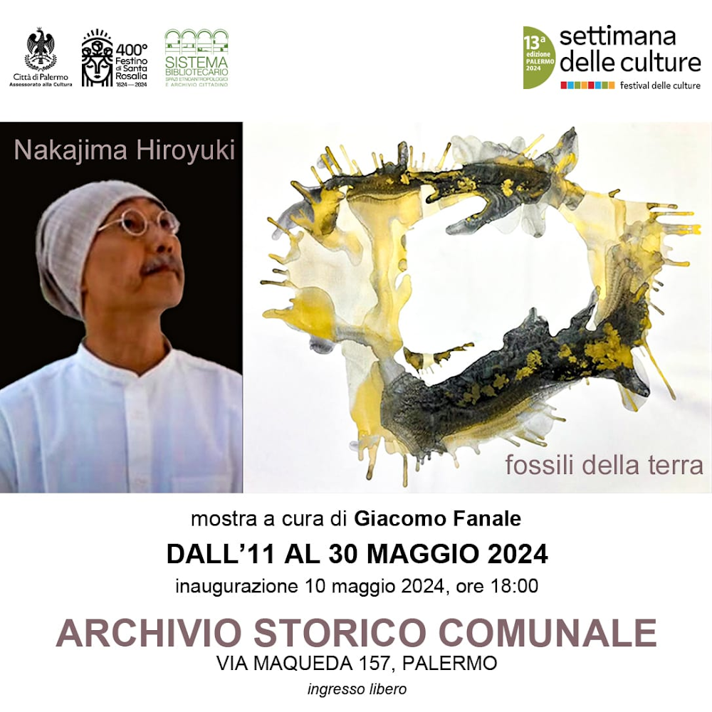 Nell'ambito della tredicesima edizione del Festival Settimana delle Culture, all'Archivio storico comunale di Palermo in via Maqueda n.157, da domani sabato 11 maggio e fino a giovedì 30 maggio, sarà visitabile la mostra dell' artista e calligrafo giapponese Nakajima Hiroyuki dal titolo " Fossili della Terra" curata da Giacomo Fanale.