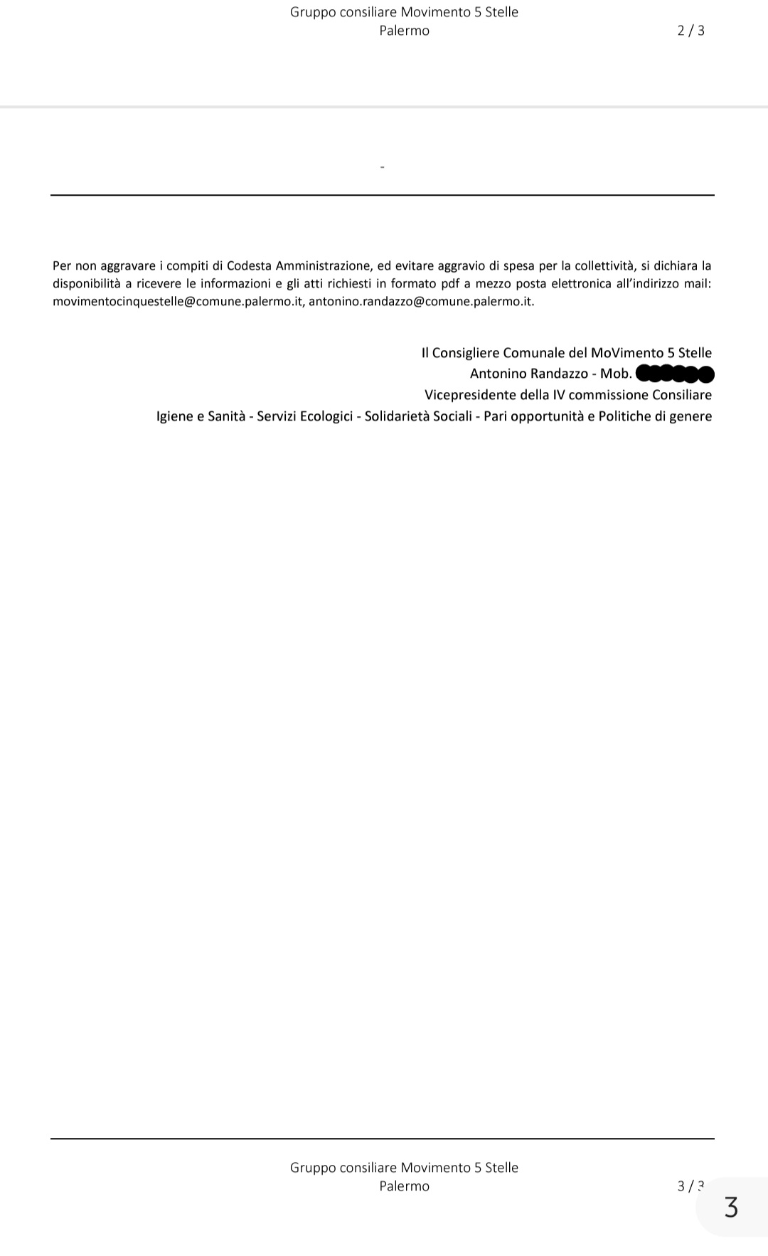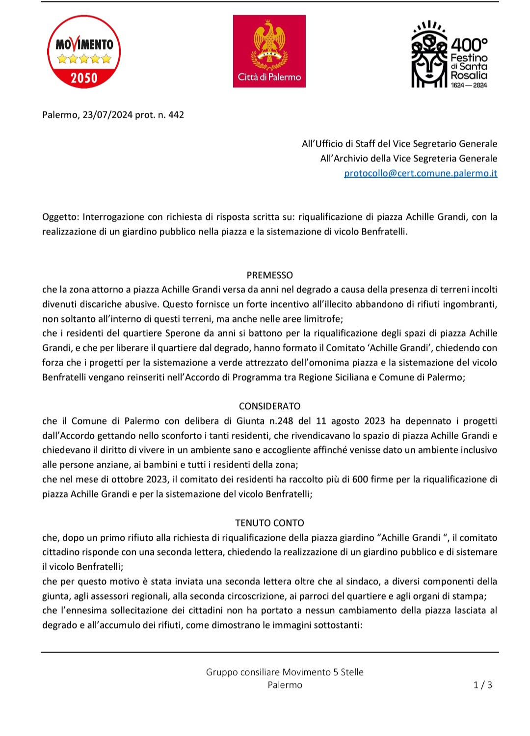Lo dichiarano il capogruppo del Movimento 5 Stelle in consiglio comunale, Antonino Randazzo e i consiglieri di seconda circoscrizione, Pasquale Tusa ed Emanuela Lo Nardo.