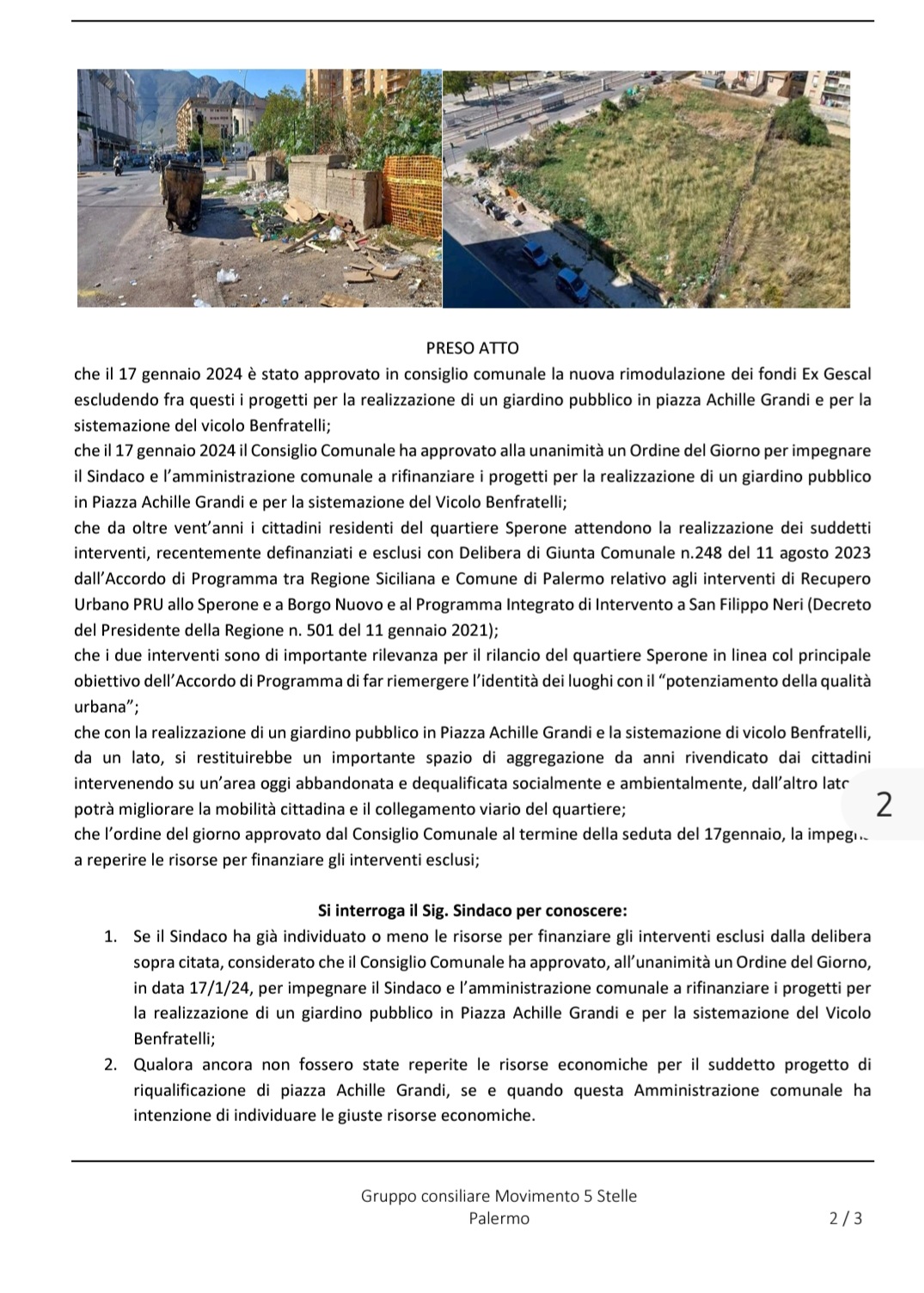 Con una interrogazione trasmessa al Sindaco Lagalla abbiamo chiesto se l’amministrazione comunale si è attivata o intende attivarsi per trovare nuove risorse per rifinanziare questi due progetti precedentemente inseriti nei Fondi Ex GESCAL così come richiesto dal Consiglio Comunale con un ordine del giorno approvato all'unanimità lo scorso 17 gennaio 2024".