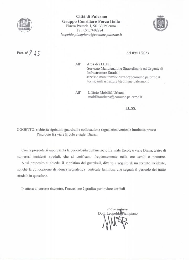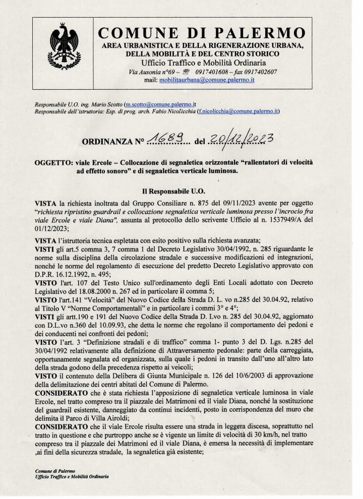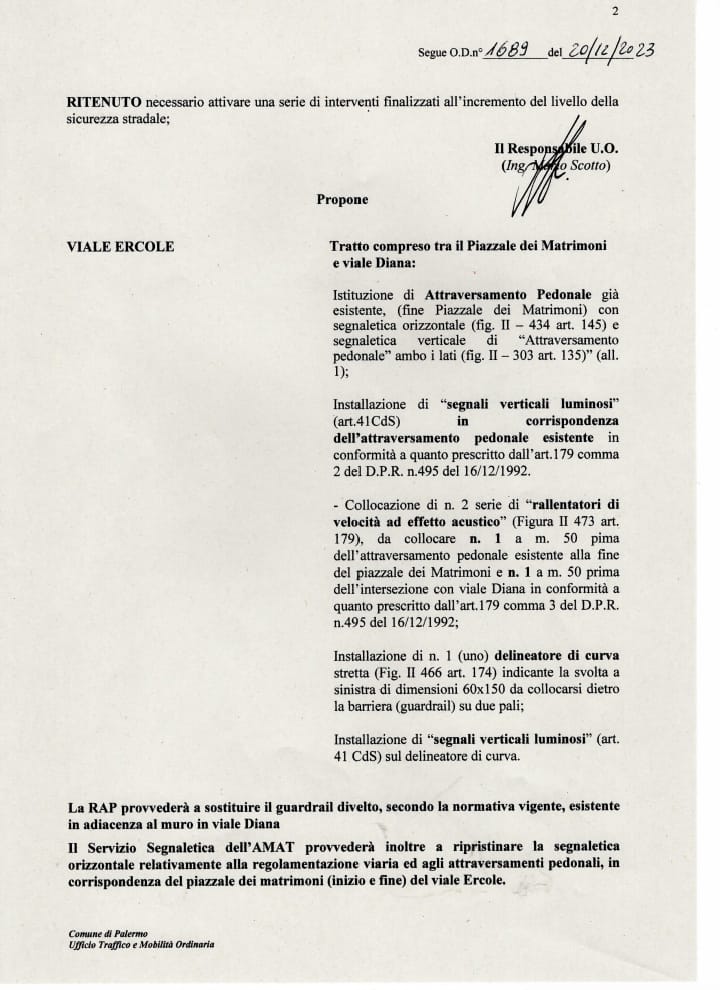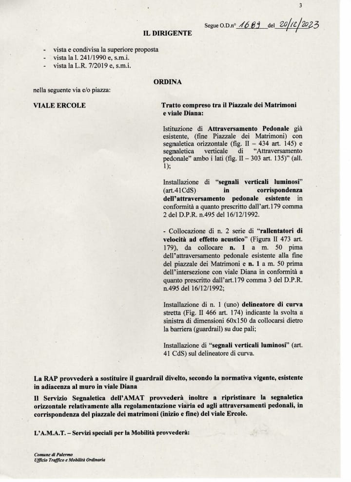 «Esprimo soddisfazione per l'adozione dell'ordinanza dirigenziale n.1689 del 20.12.2023, che riguarda viale Ercole e l'incrocio con viale Diana, con la quale si dispone la realizzazione di un attraversamento pedonale, segnali verticali luminosi, rallentatori di velocità ad effetto acustico nonché il ripristino del guardrail divelto.