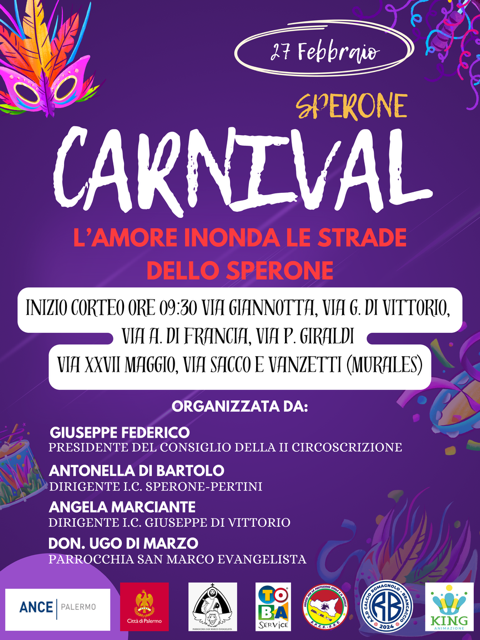 La sfilata partirà dal plesso Puglisi dell'I.C. Sperone-Pertini in via Giannotta, per poi proseguire per le strade dello Sperone, coinvolgendo gli alunni dello stesso I.C. Sperone-Pertini e dell'I.C. Giuseppe Di Vittorio.