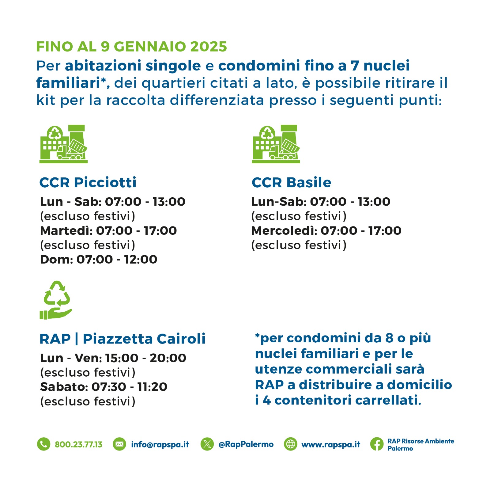 Dal 10 gennaio 2025 il centro storico di Palermo, in particolare, il quartiere 1 (Tribunale – Castellammare) e il quartiere 2 (Palazzo Reale – Monte di Pietà) saranno serviti dalla raccolta differenziata “porta a porta”.