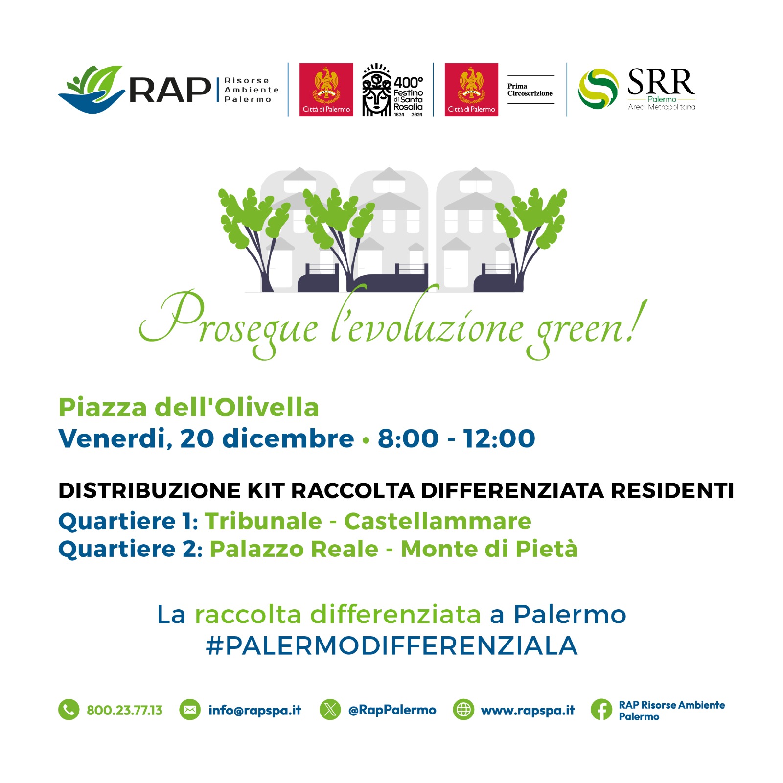 Per agevolare i residenti dell’area interessata dall’avvio del nuovo step di Raccolta Differenziata, si informa che venerdì 20 dicembre 2024, dalle ore 8 alle ore 12, a piazza dell’Olivella, potranno essere ritirati i Kit. L’iniziativa itinerante che coinvolgerà via via altri siti è stata attivata di concerto con l’Amministrazione comunale, la Prima circoscrizione e la SRR Palermo Area metropolitana.