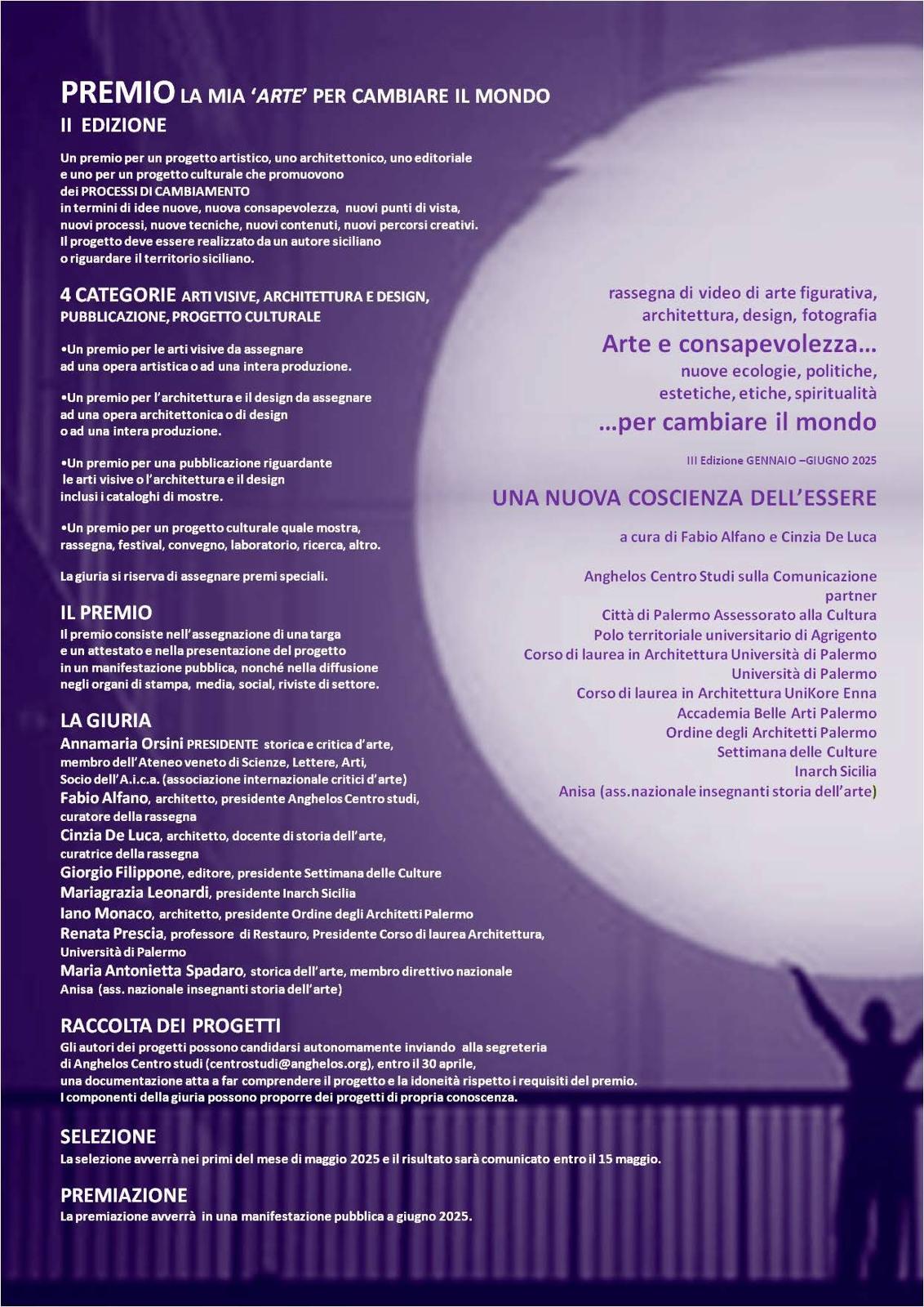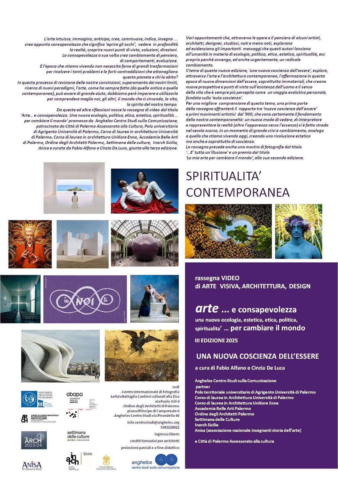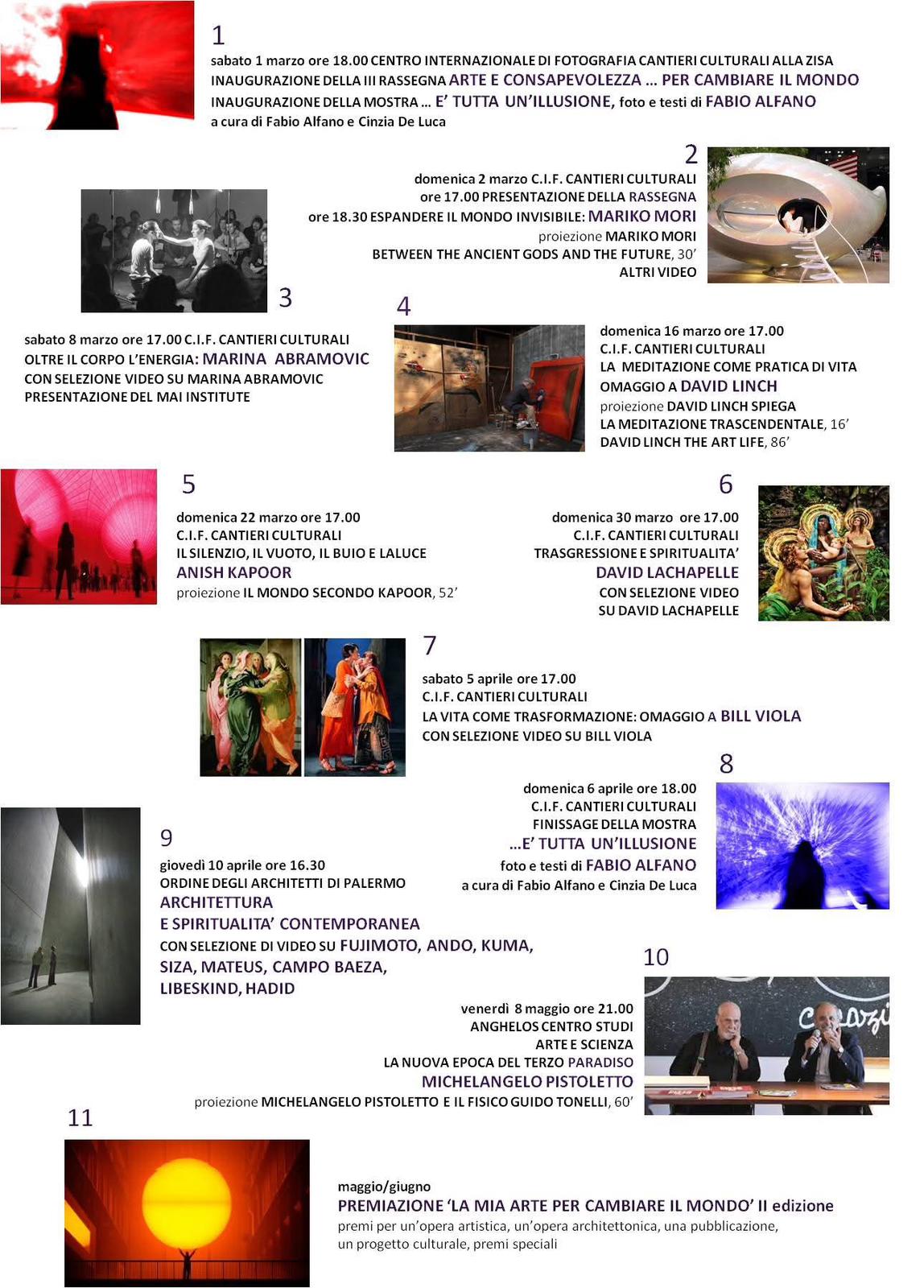 SABATO E DOMENICA 1 E 2 MARZO APERTURA DELLA RASSEGNA ‘ARTE E CONSAPEVOLEZZA PER CAMBIARE IL MONDO’ – III EDIZIONE: UNA NUOVA SPIRITUALITA’ CONTEMPORANEA INAUGURAZIONE DELLA MOSTRA ‘E’ TUTTA UNA ILLUSIONE?’ Sabato e domenica 1 e 2 marzo 2025, al CENTRO INTERNAZIONALE DI FOTOGRAFIA LETIZIA BATTAGLIA, ai Cantieri culturali alla Zisa, APERTURA della III edizione della rassegna di video ‘ARTE E CONSAPEVOLEZZA… PER CAMBIARE IL MONDO’ organizzata dal Centro studi Anghelos. La rassegna si apre sabato 1 marzo alle ore 18.00 con l’inaugurazione della MOSTRA ‘E’ TUTTA UNA ILLUSIONE?’ con fotografie e testi di Fabio Alfano (a cura di Fabio Alfano e Cinzia De Luca) e domenica 2 marzo alle ore 17.00 con la presentazione della rassegna e una proiezione sull’artista giapponese MARIKO MORI. La mostra, attraverso 40 grandi fotografie e piccoli testi, pone 10 domande fondamentali sul ‘senso della vita’, alla luce di nuove consapevolezze contemporanee, creando uno spazio di riflessione. La rassegna di video di arte, architettura, design, quest’anno con il tema ‘Una nuova consapevolezza dell’essere’, prevede 10 incontri/proiezioni su artisti quali Mariko Mori, Marina Abramovic, Anish Kapoor, David LaChapelle, ecc che con la loro arte promuovono un potente messaggio di cambiamento definendo una nuova forma di spiritualità e quindi una nuova ‘dimensione dell’essere’ fondamentale per una reale trasformazione della nostra società. La rassegna prevede anche due omaggi a due grandi artisti recentemente scomparsi, Bill Viola e David Linch, un incontro sul tema ‘Architettura e spiritualità contemporanea’ nella sede dell’Ordine degli architetti di Palermo e un incontro, che unisce arte e scienza contemporanea, che prevede, al Centro studi Anghelos, la proiezione di una conferenza dialogo tra Michelangelo Pistoletto (candidato al nobel per la pace) e il fisico Guido Tonelli. Tutti gli altri incontri si svolgeranno ai Cantieri Culturali nel Centro internazionale di fotografia. L’ingresso è gratuito. Fa parte della rassegna anche un PREMIO dal titolo ‘La mia arte per cambiare il mondo’, alla sua seconda edizione, da assegnare a giugno ad artisti, architetti, promotori culturali, siciliani o che operano in Sicilia, su opere artistiche o architettoniche e su progetti editoriali e culturali che promuovono un reale cambiamento proponendo nuovi punti di vista e nuova consapevolezza.