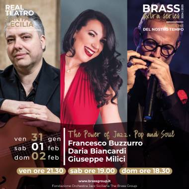 Palermo 29 gennaio La Fondazione Orchestra Jazz Siciliana - The Brass Group annuncia un grande evento inserito nella programmazione della Rassegna Brass extra Series 2025. Per la prima volta insieme, nello storico Real Teatro Santa Cecilia, ben tre stars che si sono esibiti su palchi internazionali, dagli States al Giappone, con un progetto unico ed inedito. I riflettori si accenderanno con uno show in una prima assoluta su Francesco Buzzurro, Daria Biancardi e Giuseppe Milici con ben tre date, venerdì 31 gennaio ore 21.30, sabato 1° febbraio ore 19.00 e domenica 2 febbraio 2025 ore 18.00. Il concerto seguirà un programma che varia dal Jazz, al Pop ed al Soul con peculiari cifre stilistiche che caratterizzano i tre musicisti.