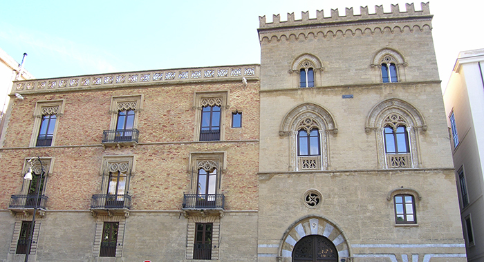 Appartenuto ai Galletti e La Grua, principi di Fiumesalato. Il palazzo risale al XVI secolo, ma venne restaurato in un ibrido stile neogotico nel 1866 dall’architetto Tommaso Di Chiara che vi profuse l’intero repertorio dei possibili riferimenti stilistici come la torre merlata e i lavori a traforo delle aperture.